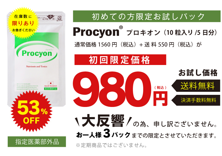ネットで検索すると数えきれない種類のサプリに困惑するも、人気や口コミでは指定医薬部外品で高評価のプロキオンがヒット、早速入手を決意。